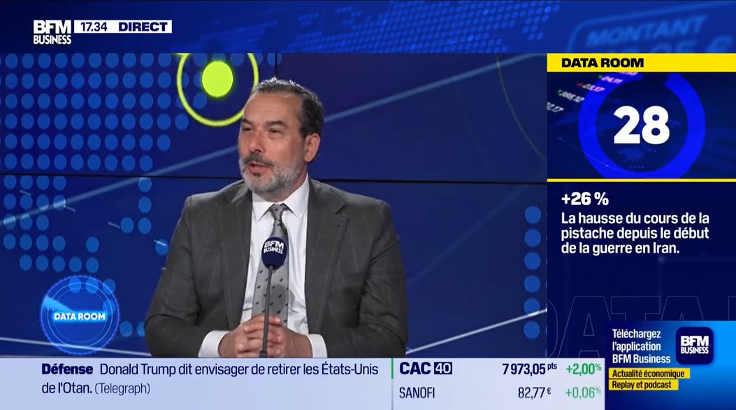 La Data Room - +26% : la hausse du cours de la pistache depuis le début de la guerre car l'Iran est le deuxième producteur mondial - Mercredi 1er avril, Raphaël Thuin, directeur des stratégies de marchés de capitaux chez Tikehau Capital, ainsi que Sébastien Korchia, directeur général et directeur des investissements chez COGEFI Gestion, se sont penchés sur la nouvelle levée de fonds d'OpenAI, évaluée à 122 milliards de dollars, et sur la hausse du cours de la pistache depuis le début de la guerre en Iran, estimée à 26%, dans l'émission BFM Bourse présentée par Antoine Larigaudrie sur BFM Business [...]